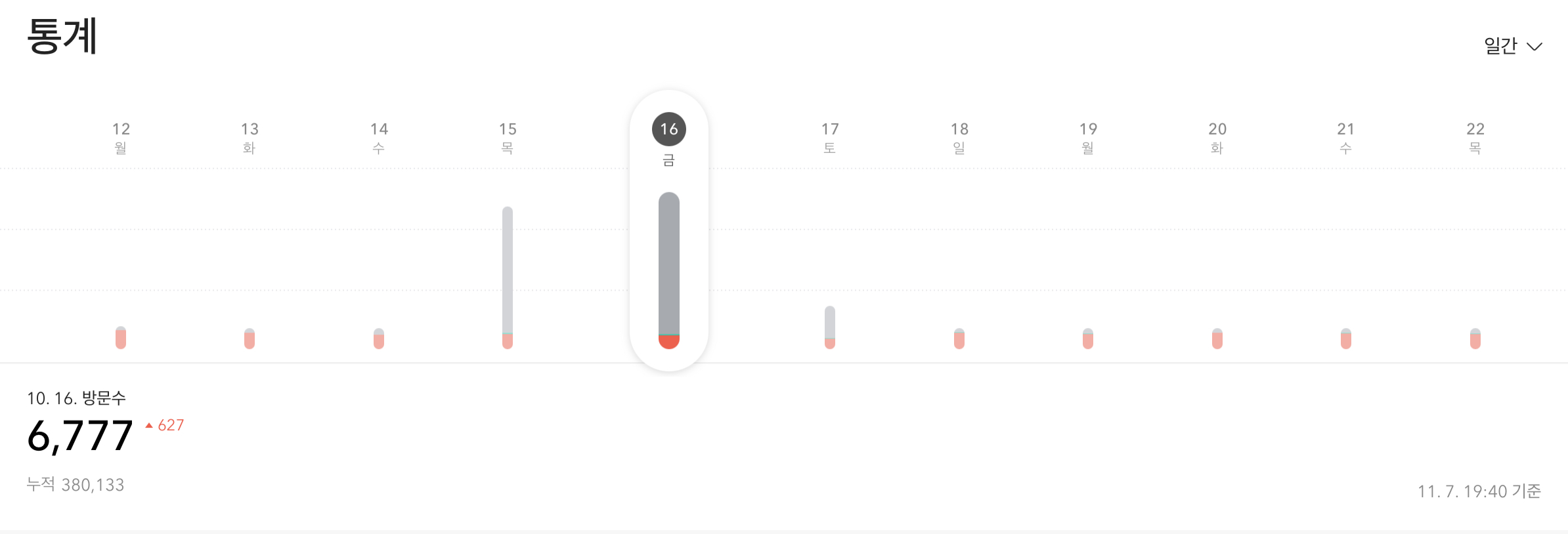 그럼에도 불구하고 10월달의 월간 방문자 수가 3만 3천여명이 된 이유는 10월 15일과 16일 일간 방문자수가 6,150명과 6,777명으로 블로그를 하면서 예전에 네이버 블로그 에서 비슷한 숫자의 일 방문자 수를 보인 적이 있지만 티스토리에서는 작년의 월간 방문자 수와 비슷할 정도로 하루만에 6천명 2일 동안 거의 월 방문자 수의 절반인 1만 2천명 정도의 방문자 수를 보여주었다.