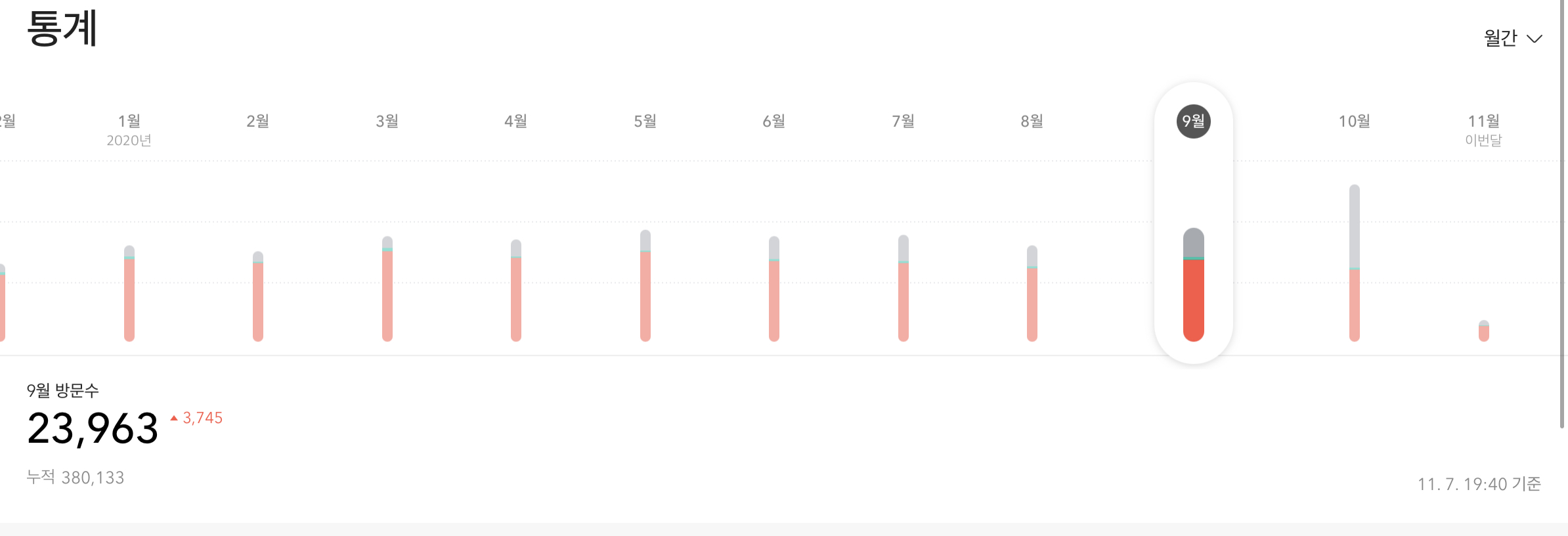 9월 달에는 그래도 몇건의 글을 작성하면서 꾸준히 블로그를 해야지 하는 생각을 했지만 생각보다 작성한 글은 많이 없었습니다. 일이 많이 바빠지기 전의 체력이라 블로그 작성하는 여유는 있었는데 9월달의 월간 블로그 방문자 수는 23,963명 7월과 8월을 비교해서도 살짝의 방문자 수 증가 수를 보였습니다.