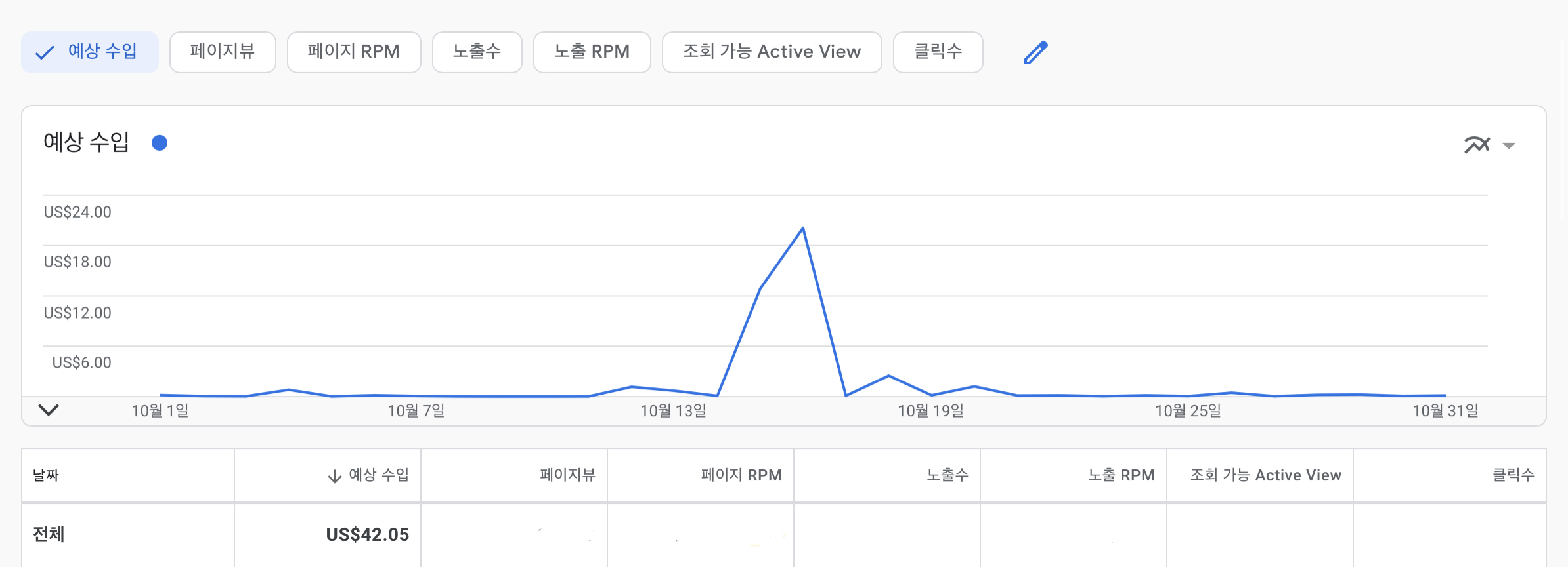 10월달 예상 수입은 42.05달러 최소 목표가 100달러인 애드센스를 본다면 최소 지급금액의 절반에 가까운 42.05달러 그래프만으로 본다면 10월 1일 ~ 13일 다시 19일 ~ 31일까지의 일 수익금은 모두 1달러도 안되는 0.10 단위의 수익금을 보여주었지만 다행이도 15일과 16일 방문자가 폭등한 날에는 15일 12.85달러 16일에는 20.10달러로 32달러 정도 약 2일을 제외한 29일동안 10달러로 15, 16일을 수익금을 제외한다면 월 평균 수익금과 크게 다르지 않았다.