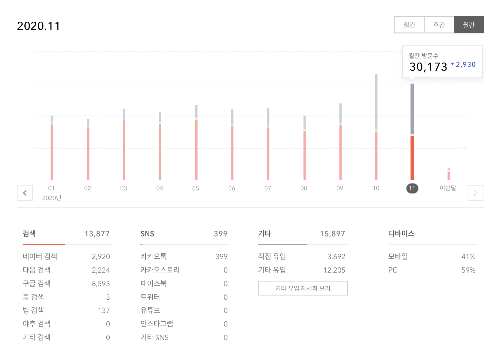 11월달 월간 방문자 수는 30,173으로 10월달에 비해서는 2,930명이 줄어 들었습니다. 방문 유입을 가장 많이 차지한 것은 11월에도 "직접 유입"과 "기타 유입"으로의 방문수가 가장 많았습니다.