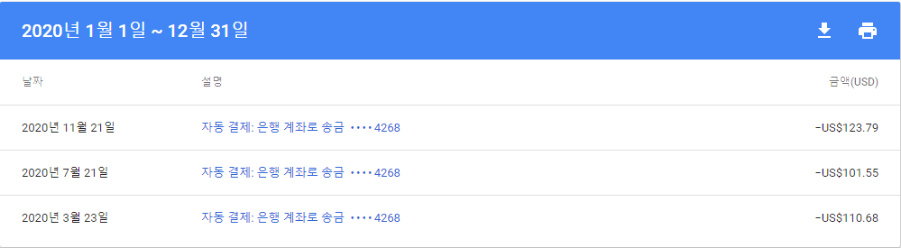 5번째 목표인 애드센스 수익금 2회 수령하기! 목표는 2020년에 3월, 7월, 11월 각각 110.68달러 , 101.55달러, 123.79달러 총 336.02달러(수수료 계산 전) 받았네요 ㅎㅎ 2021년 목표에 다시 3회 수령으로 도전!!!