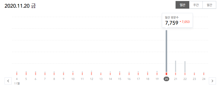 블로그 일 방문자 수 1,000명 넘기기는 10월달과 11월달 폭등한 방문자 수로 겨우겨우 달성 할 수 있었는데... 일 평균 1,000명이 아니라 그냥 1,000명으로 설정했네요... 아무 생각 없죠.. 이것도 성공했다고 해야하나. 애매하네요..