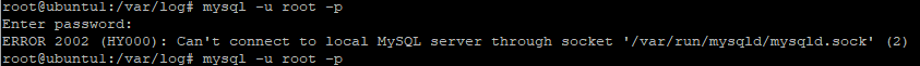 ERROE 2002 (HY000) : Can't connect to local MySQL server through socket '/var/run/mysqld/mysqld.sock' (2)