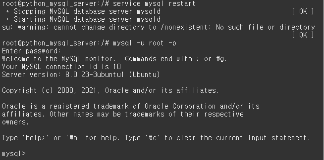 mysql 서비스를 재시작 해주고 다시 mysql에 접근을 시도하면 정상적으로 mysql에 접근할 수 있게됩니다.