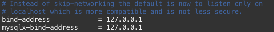 mysqld.cnf 파일을 오픈해보면 bind-address = 127.0.0.1 이 작성된 라인을 확인 할 수 있습니다. 해당 라인을 지우거나 "#"을 사용해 주석처리를 해주시면 됩니다.