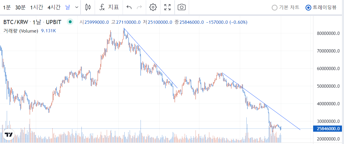 업비트 기준 2021년 11월 비트코인의 최고가 8,100만원에서 2022년 7월 1일 2,500만원까지