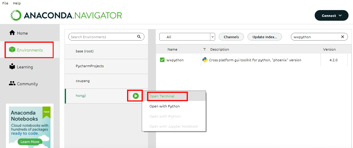 파이썬 버전 3.8, 3.9, 3.10 등등 아나콘다 네비게이터에서 검색해 설치하게 되면 오류가 발생합니다. 아나콘다 네비게이터로 검색하면 wxPython 버전 4.0.4 버전을 설치 할 수 있도록 되어있기 때문에 호환성이 맞지 않아 설치가 불가능하기 때문에 Environments 에서 wxpython 라이브러리를 설치할 가상환경의 플레이버튼을 눌러 "Open Terminal"에서 pip 명령으로 설치해주시면 됩니다.