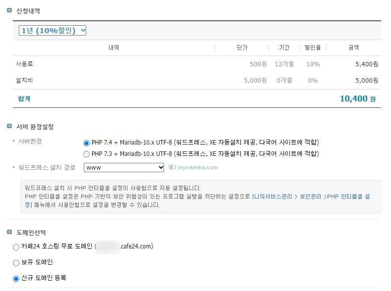 베이직 무료 월 500원짜리 12개월 신청시 10% 할인 받아 5,400원에 설치비 5,000원 총 10,400원의 금액에 만들 수 있고 도메인 또한 기본으로 카페24 호스팅 무료 도메인으로 (계정.cafe24.com)의 서브 도메인을 사용 할 수 있습니다.