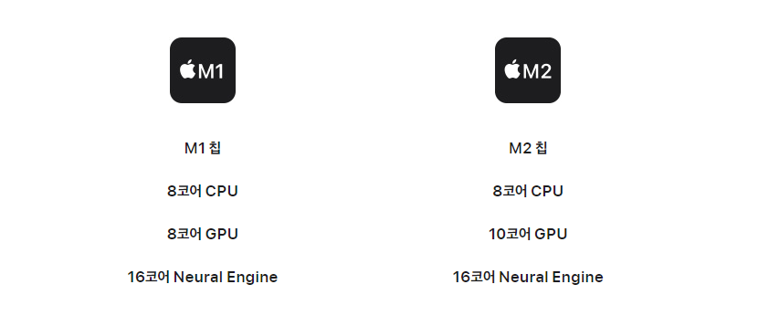 M2칩과 M1칩을 비교하면 GPU가 8코어에서 10코어로 늘어났어요. 그만큼 그래픽을 처리하는 속도가 향상되었어요.