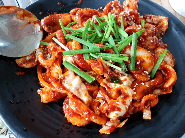 직화 쭈꾸미 볶음 2인분 4명이서 먹을때는 하나로 통일해서 4인분 먹는 것 보다는 2개씩 나눠서 두가지 메뉴를 먹는 걸 추천드려요. 썩어서도 주문이 가능하고 따로따로 주문이 가능합니다. 원래 오늘 쭈꾸미 낚시를 하러 갔었어야 하는데... 태풍 미탁이 올라와서 취소된슬픔을.. 복사꽃피는집에서 쭈꾸미를 먹는걸로 해결...