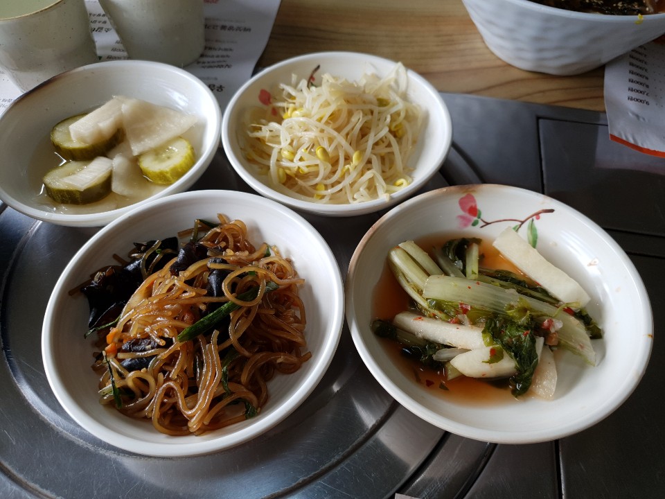 기본 반찬중에서 셀러드(파스타)?와 묵사발이 있는데요 개인적으로 처음에 기본에 나오는 셀러드랑 묵사발 맛있어요. 특히 여름철에는 묵사발이 생각나서 복사꽃핀집이 생각이 날정도에요..